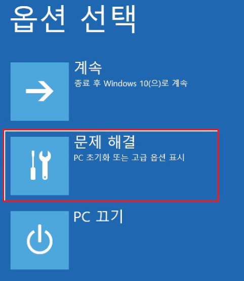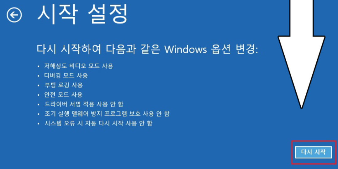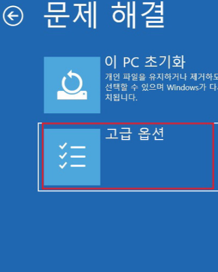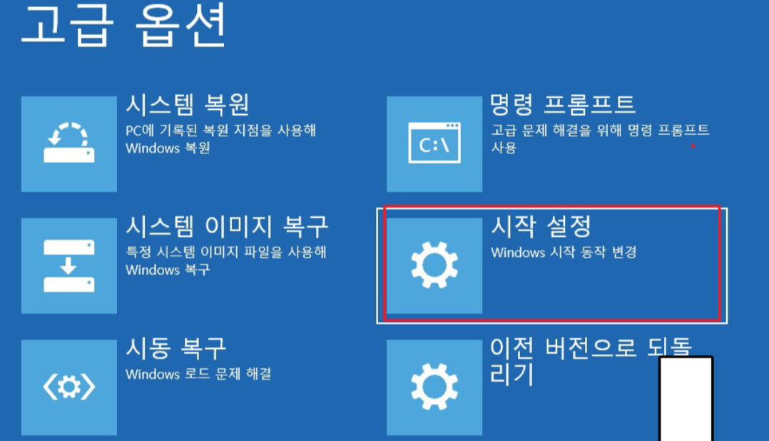옵션선택 - 문제해결 - 고급옵션 - 시작설정