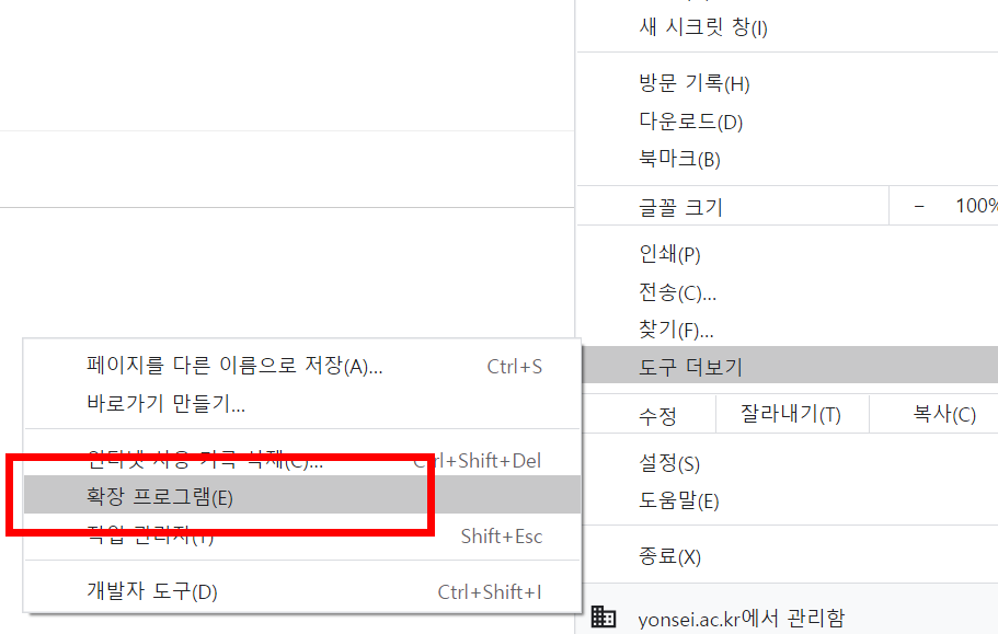 하지만 저도 그렇고 많은 분들은 크롬브라우저의 메뉴를 이용하여 접속하게 되는데요. 크롬브라우저 오른쪽 상단의 점세개 표시인 "Chrome 맞춤설정 및 제어"를 클릭해주고, "도구 더보기"에서 "확장프로그램"을 클릭해줍니다.