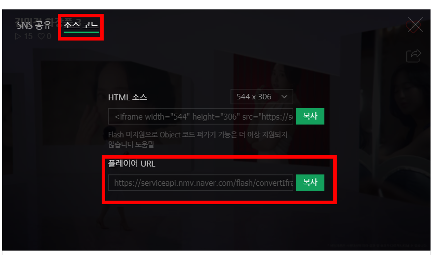먼저 다운받을 동영상의 URL을 알아와야겠죠? 동영상 오른쪽 상단의 "공유하기"버튼을 클릭해줍니다. 보통은 여기에서 SNS공유에 나오는 URL주소등을 활용하는데요. 여기서는 조금 다른 방식을 사용해야 합니다. 상단의 "소스코드"를 클릭하고 "플레이어 URL"을 복사해줍니다.