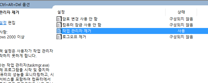 해보실 분들은 사용자 구성 - 관리 템플릿 - 시스템 - Ctrl+Alt+Del 옵션에서 "작업 관리자 제거"가 "사용"으로 되어 있는 경우에 "구성되지 않음"으로 바꾸어보시기 바랍니다. 그런데 제가 볼 때는 이건 올바른 해결 방법이 아닙니다. Ctrl+Alt+Del 을 눌러서 재부팅 대기화면이 나왔을 때 "작업관리자"를 표시해줄 것인지 아닌지를 선택하라는 의미인 듯 한데, 이걸 해결방법으로 제시하는 글들이 상당히 많더군요.