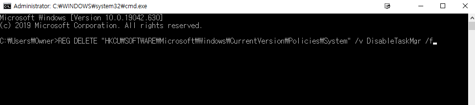 REG DELETE "HKCU\SOFTWARE\Microsoft\Windows\CurrentVersion\Policies\System" /v DisableTaskMgr /f