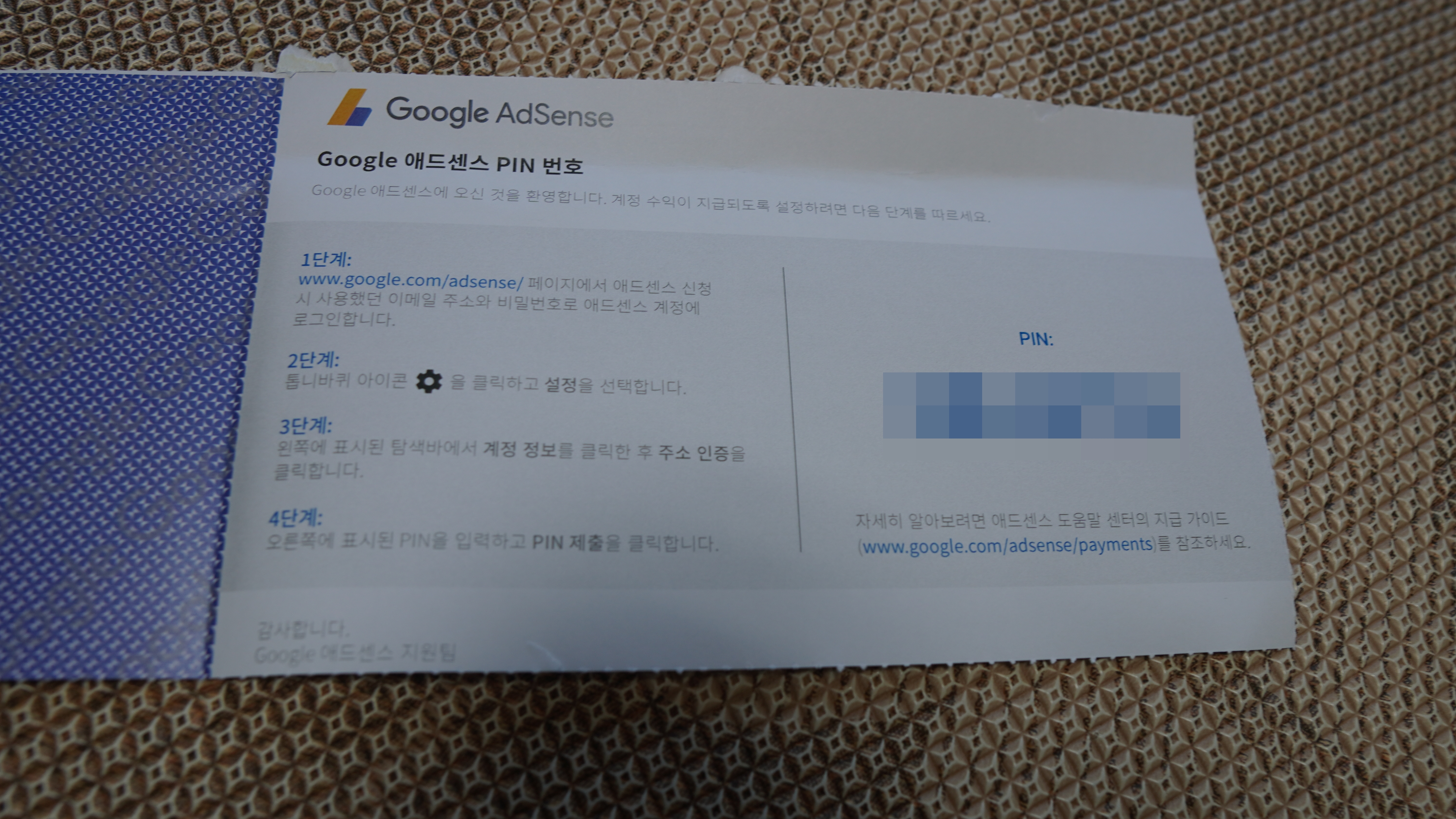 이제 이 우편물을 펼쳐주면.. 드디어 구글 애드센스 핀 번호가 나타나게 되는데요.