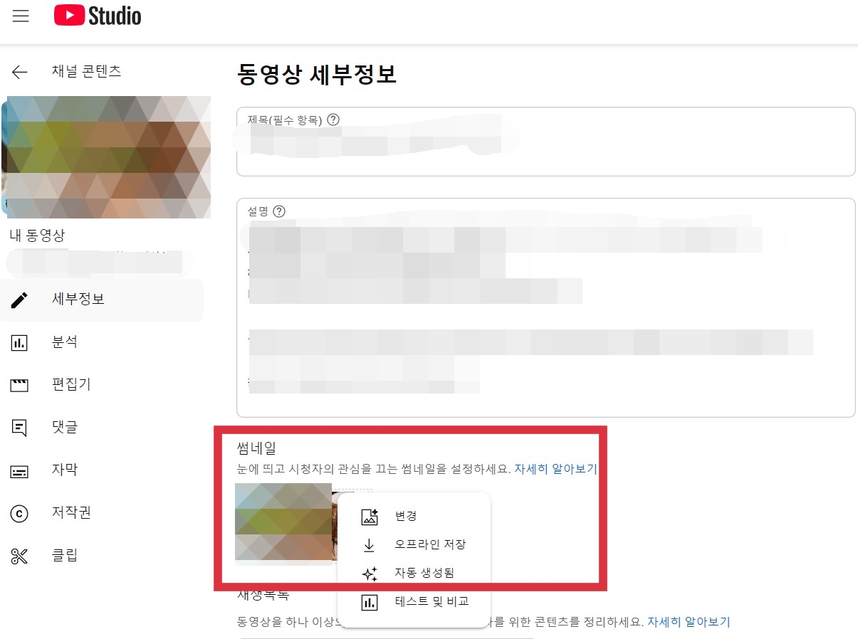 롱폼은 유튜브 스튜디오 등에서 해당 동영상의 수정 화면으로 가서 썸네일을 변경하면 되는데요.