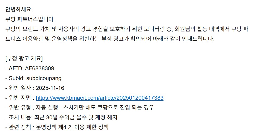 쿠팡의 브랜드 가치 및 사용자의 광고 경험을 보호하기 위한 모니터링 중, 회원님의 활동 내역에서 쿠팡 파트너스 이용약관 및 운영정책을 위반하는 부정 광고가 확인되어 아래와 같이 안내드립니다.