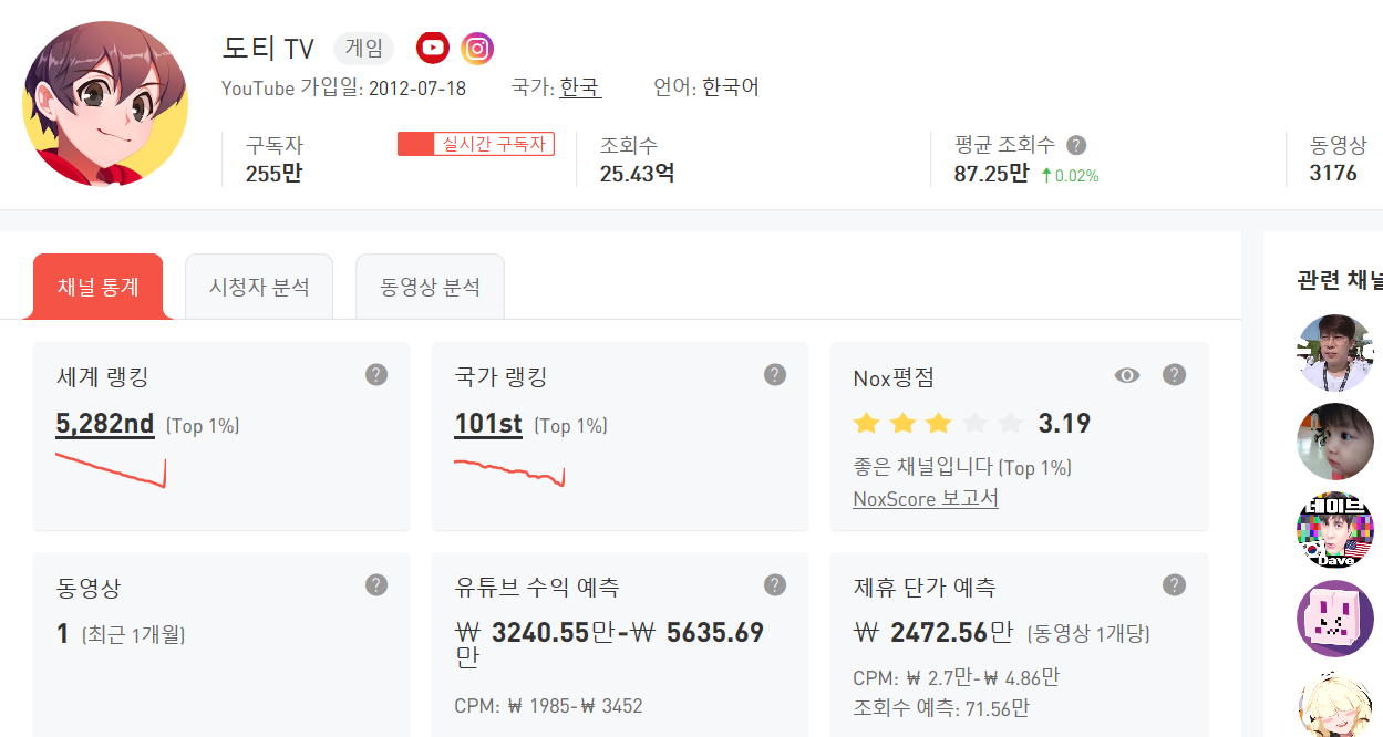 평균조회수는 87만으로 양호하고 Nox평점이 3.19네요.