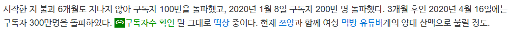 나무위키에 나와있는 글인데요. 시작한지 6개월만에 10만도 아닌 100만, 2020년 1월에 200만, 4월에 300만의 구독자를 확보한 남다른 이력이 있습니다.