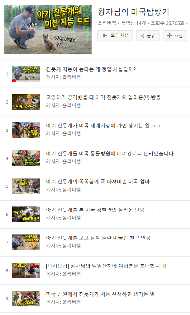 최근에 제가 이 채널을 보면서 불편했던건 미국으로 데려가서 키우고 있는 진돗개 "왕자"라는 강아지에 대한 영상인데요. 논란을 의식했는지 해명하는 영상이 있긴 한데.. 대부분은 진돗개가 맞냐 아니냐로 시비거는 댓글 때문인 듯 합니다.