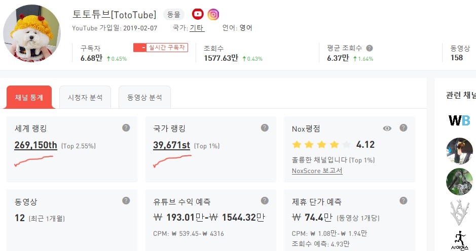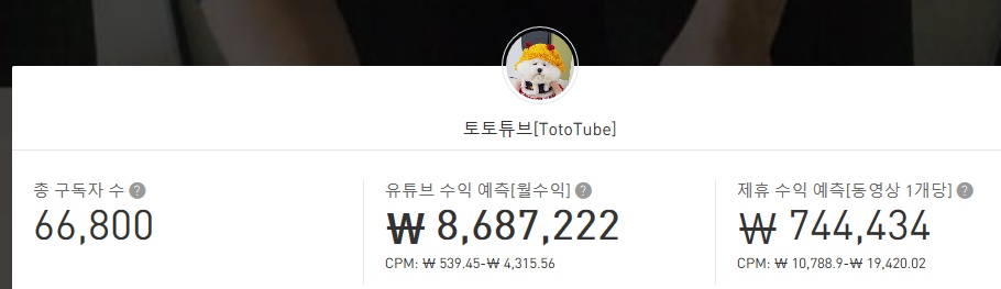 전체 동영상 개수에 비해 평균 조회수가 많지 않아서 수익이 적은 걸로 보이는데요. 1000회 정도로 조회수가 많지 않은 영상들이 있다보니 그런 듯 합니다. 대다수의 영상들이 조회수가 많았다면 수익이 훨씬 올라갔을텐데 토토의 명성에 비해 조금 아쉬운 측면이 있습니다.