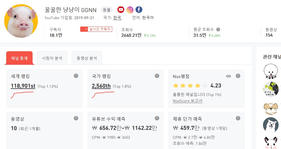 [토토튜브]채널의 월수익 예측이 8백6십만원이었으니, 8백9십만원인 [꿀꿀한 냥냥이]채널도 비슷한 수준이라고 할 수 있겠는데요. 이슈가 되고 명성이 있는 동물이 주인공인 채널이라고 하더라도, 수입에는 어느정도 한계인가 있는게 아닌가 싶기도 합니다.