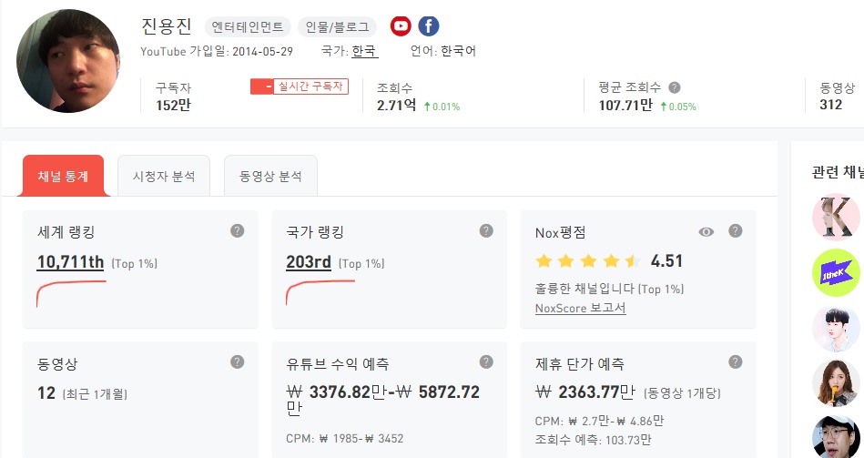 구독자가 152만에 달하는 '진용진'채널만을 대상으로 분석해보도록 하겠습니다.