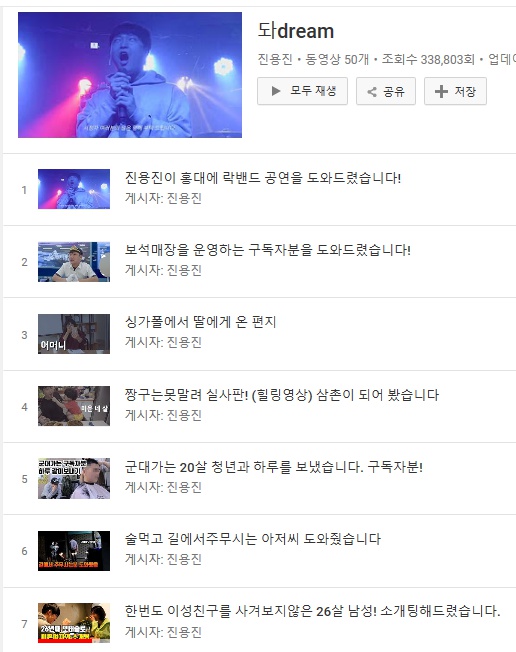 youtube를 시작하시려는 분들은 이 점을 꼭 참고하셔야할 것 같고요. 진용진님도 부디 초심을 잃지 않았으면 좋겠습니다. 진용진님의 컨셉을 따라하는 채널들도 가끔 보이는데.. 좋아보이지는 않습니다.