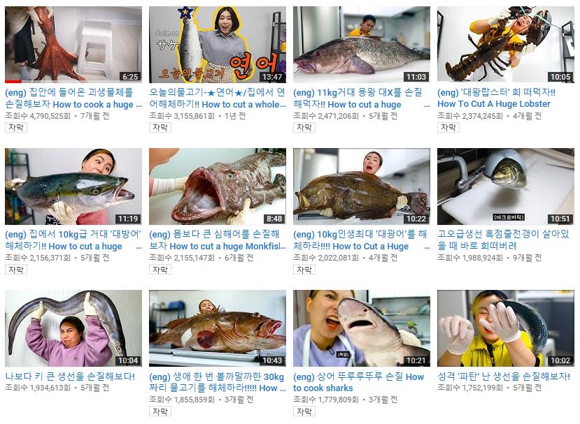 등등 집에서 거대 생선을 요리해먹는 영상들이 제일 인기가 많았습니다.