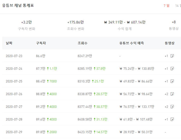 7월 25일 기준 구독자는 7000명 늘었습니다.