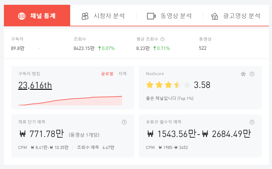 총 동영상 갯수는 522개 이속, 구독자 랭킹으로 보면 전세계 23616위, 우리나라에서 461위입니다. 엄청나네요.